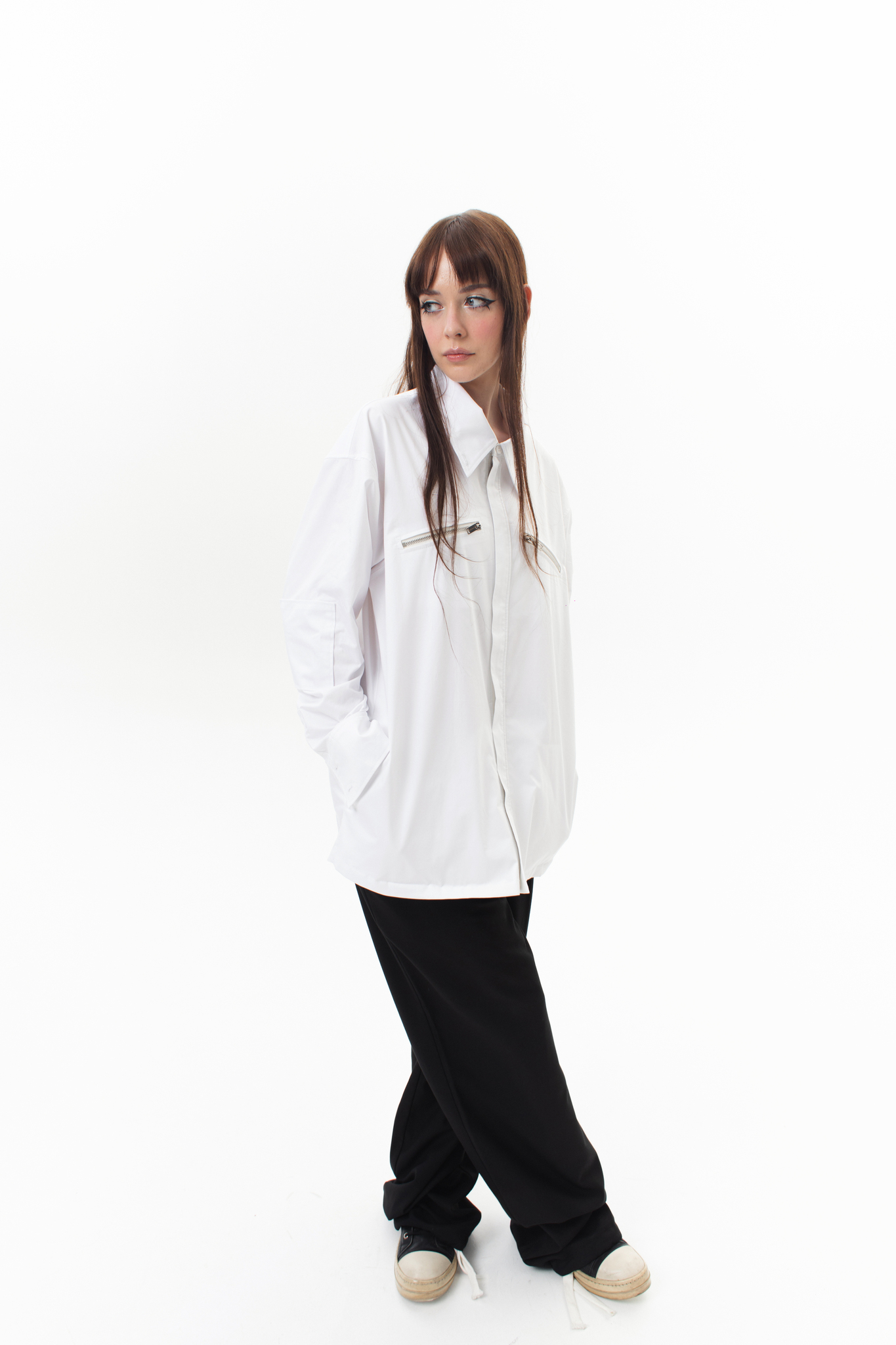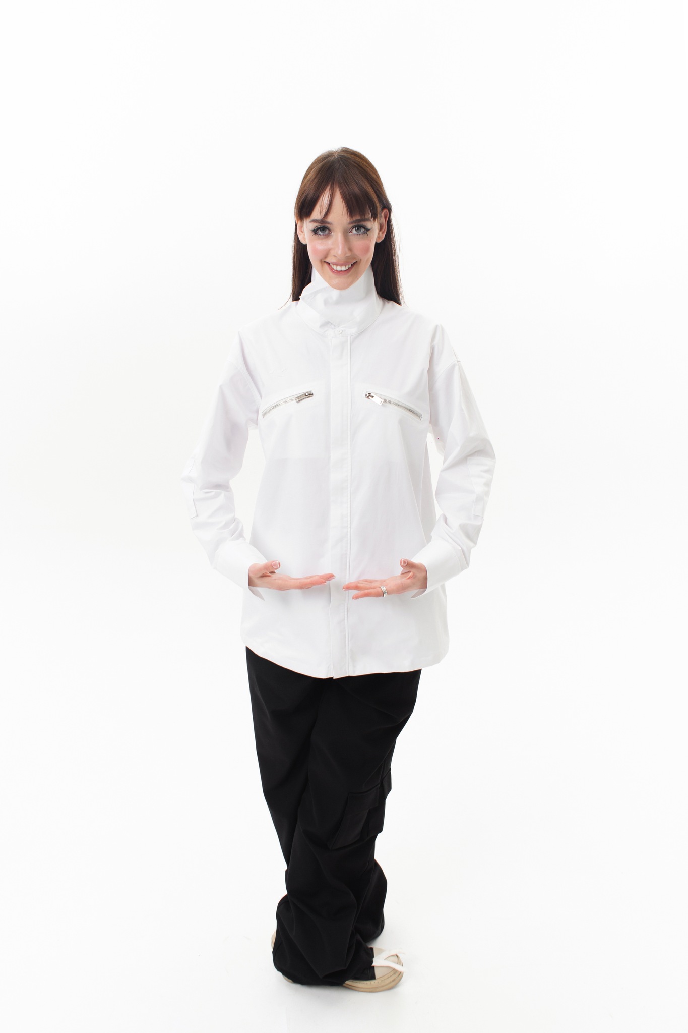 Рубашка, выполненная из плотного стопроцентного хлопка на застежке молнии с дополнительной планкой. По переду изделия расположены карманы в рамку, на застежке молнии.